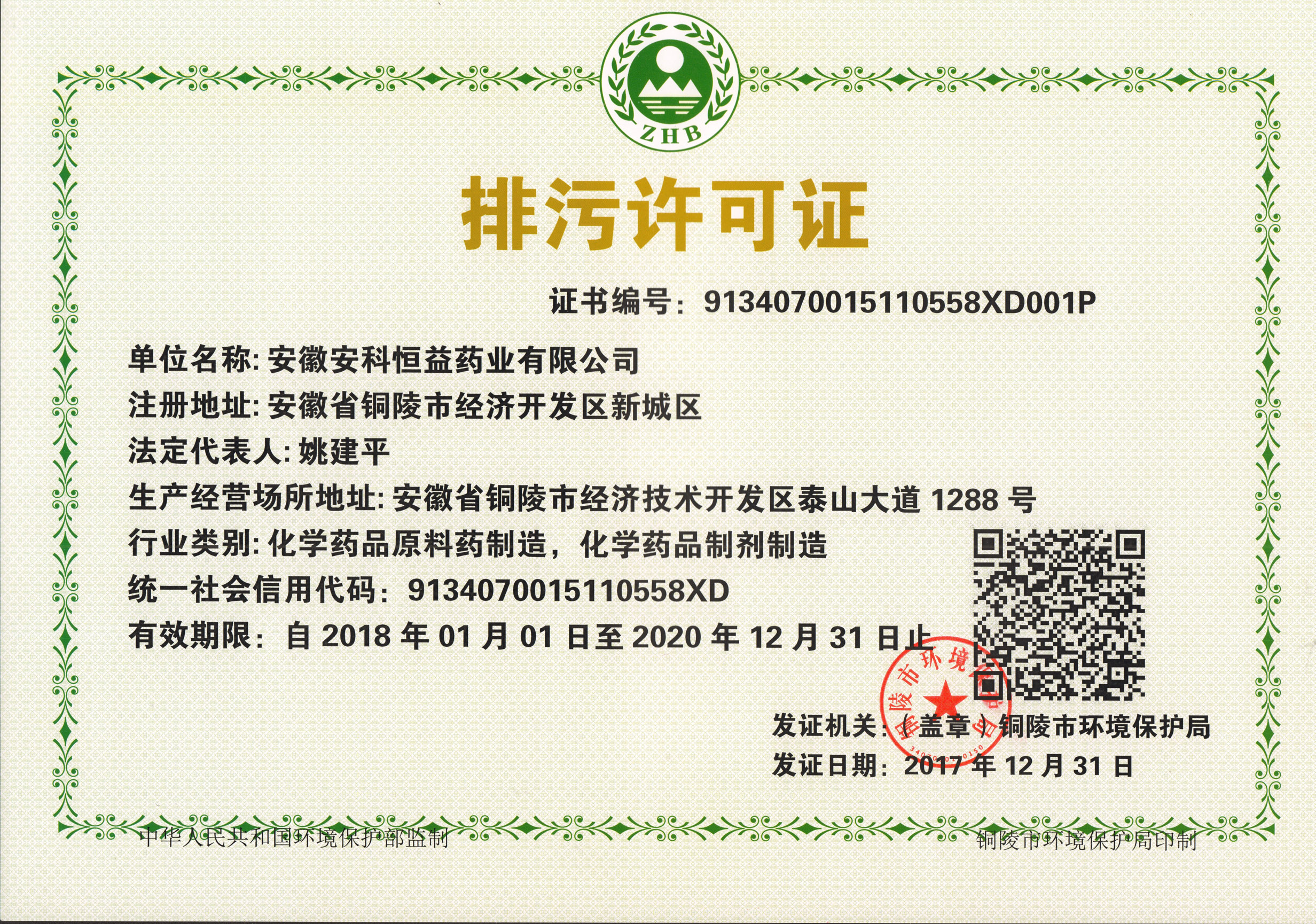 近日,我公司涉及化學原料藥制造及化學藥品制劑制造范圍內取得銅陵市環保局頒發的 “排污許可證”,我公司排污許可證是區域內首批取得的單位,相比原有的排污許可制,本次排污許可制有機銜接環評制度,整合總量控制制度,強化了對固定污染源實施全過程管理和多污染物的協同控制,實現對固定污染源的“一證式”管理。據悉本次的排污許可證載有獨有的二維碼信息,公眾只要掃一下二維碼,企業的地理位置、生產設施、排污狀況、執行標準、監測要求、排污去向等信息就會全部顯示出來,可以非常方便地了解企業環保執行情況。