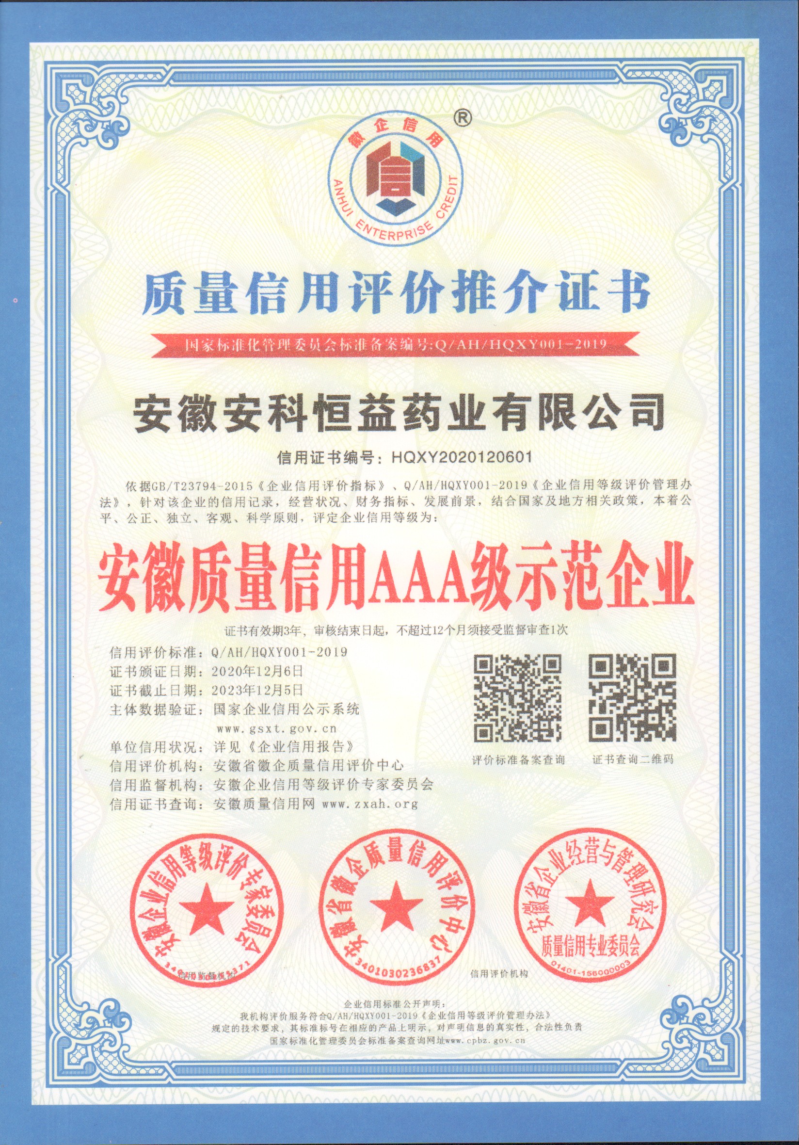安徽省徽企質(zhì)量信用評價(jià)中心和安徽企業(yè)信用等級評價(jià)專家委員會(huì)依據(jù)GB/T23794-2015《企業(yè)信用評價(jià)指標(biāo)》、Q/AH/HQXY001-2019《企業(yè)信用等級評價(jià)管理辦法》,針對我公司的信用記錄、經(jīng)營狀況、財(cái)務(wù)指標(biāo)、發(fā)展前景,結(jié)合國家及地方相關(guān)政策,本著公平、公正、獨(dú)立、客觀、科學(xué)原則,評定公司企業(yè)信用等級為:安徽質(zhì)量信用AAA級示范企業(yè)。并頒發(fā)了獎(jiǎng)牌及證書。
