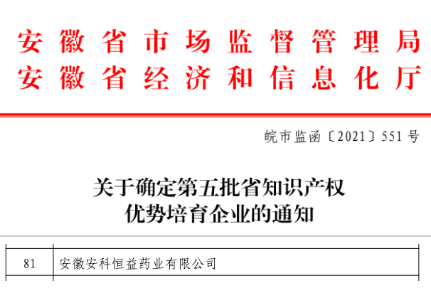 近日,安徽省市場監管局、安徽省經濟和信息化局公布了第五批“安徽省知識產權優勢企業”名單,我公司成功入選。